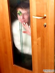 Horny dude jerking off while watching black-pantyhosed chick pissing in WC